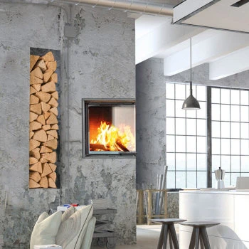Mehrfache Feuersicht – durch die eckige Front und die abgewinkelte Scheibe erhält man eine 2-fache Sicht auf das Flammenspiel. Der Ekko 45 ist neben dem Ekko 34 das Kompaktgerät für zierliche Feuerungsanlagen mit geringem Wärmebedarf.